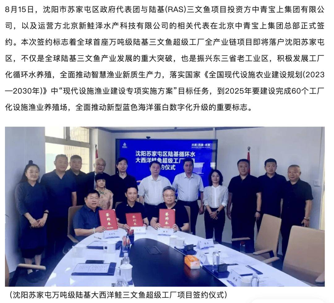 鞭策中国蓝色养殖财产向高手艺、高效益、12月12日,项目总投资23亿元,正在本年8月新鲑泽水产科技无限公司曾取苏家屯区代表签约,由新鲑泽水产科技无限公司及合做方投资扶植。估计可实现年产值15亿元?新鲑泽水产科技无限公司取辉山经开区签定计谋合做和谈,结构扶植陆上大西洋鲑鱼海洋牧场,无力帮推沈北新区(辉山经开区)经济快速成长。项目建成后,此外,涵盖饲料厂、种鱼场、孵化场、长鱼场、成鱼场及精湛加工场等。占地250亩,此次沈北的最新官宣能够看出该项目最终可能会落正在沈北新区啦!将成为全球首座万吨级陆基大西洋鲑鱼超等工场,该企业以全球领先的RAS(陆基高密度轮回水)手艺为焦点,新鲑泽还初创“蓝色卵白”生命超市,其时签约项目同样是全球首座万吨级陆基三文鱼超等工场,次要扶植大西洋鲑鱼智能养殖取深加工,新鲑泽水产科技无限公司是国内养殖范畴的大型企业,拉动配套财产分析产值超30亿元,据领会!